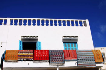 突尼斯海灣的邊上靜靜的藍(lán)白小鎮(zhèn),在透明的陽光中呼吸出了浪漫的色調(diào),這里被譽(yù)為“小圣托里尼”。之所以稱它為“藍(lán)白小鎮(zhèn)”,是因?yàn)檫@個(gè)坐落在地中海邊峭壁上的鎮(zhèn)子,所有的房屋只有兩種顏色,白色的墻,藍(lán)色的門窗。如此單純,卻是如此美麗。整個(gè)小鎮(zhèn)是沿山勢(shì)蜿蜒而上的,布局很簡(jiǎn)單,一條鵝卵石鋪就的街道,兩邊是在陽光下閃閃發(fā)亮的白色房屋,也有些小巷從屋子內(nèi)伸出去。房屋都只有二三層高,最讓人感覺仿佛置身于童話的,是那白色墻上鑲嵌著的藍(lán)色的鐵窗和藍(lán)色的木門。阿拉伯式的蔓藤渦卷展現(xiàn)在鐵窗窗欞,對(duì)稱而迷幻;木門上半部的穹頂代表著清真寺的建筑,門上的藍(lán)色銅釘則拼合出星星和月亮,還有弓箭、花卉等伊斯蘭圖案,華麗而精美。