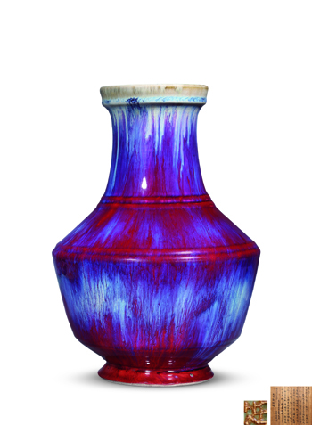 來(lái)源于久原躬弦舊藏的“清雍正·窯變釉盤口弦紋瓶”最終以383.5萬(wàn)港幣成交。窯變釉是雍正時(shí)唐英督理景德鎮(zhèn)御窯廠時(shí)仿鈞窯釉色所繁衍出的一個(gè)創(chuàng)新品種,此件作品即為以窯變之釉色燒制當(dāng)朝創(chuàng)新之器型,紅紫交融,合于天造,厭于人意。