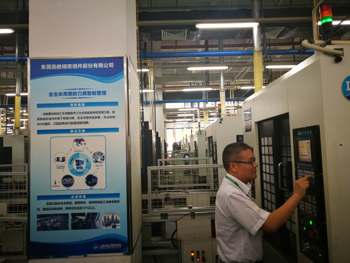 “每條線都有一個變速機看板,看板上會顯示這條生產線最新的狀態(tài),包括CNC的開工情況。就像這條生產線的22臺機器狀態(tài)中,有19臺處在加工狀態(tài),3臺處在離線狀態(tài)。這條生產線結果達成率為88.5%,那這個白班的加工率為85.06%,夜班的加工率43.46%,已完成加工產品482件,這些都能直觀地顯示出來?!眲艅傧嚓P工作人員介紹,“員工也可以拿著iPad,掃描CNC機上的二維碼,iPad上就顯示這是哪臺機床,正在加工的是哪種產品,用的是哪些輔助材料,哪一把刀?!?/p>
