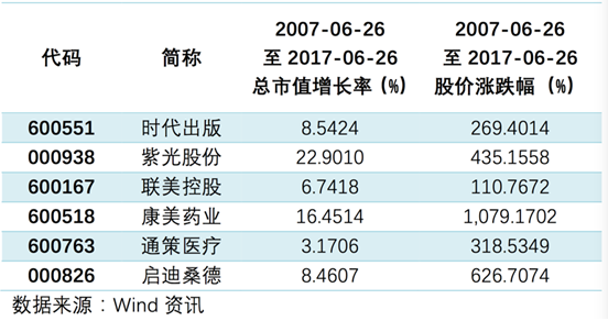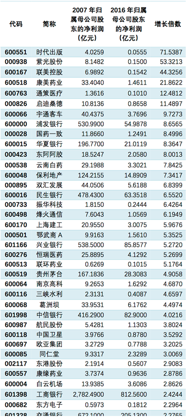 ????時代出版以十年71.54倍的漲幅排在第一位,同時也是唯一的一家文化傳媒類上市公司。紫光股份、聯(lián)美控股、康美藥業(yè)、通策醫(yī)療、啟迪桑德等五家上市公司在過去十年中也為股東創(chuàng)造了增幅超過10倍的凈利潤。不過,由于多家公司的規(guī)模相對較小,凈利潤增加的絕對值并不高,除了如今總市值已經穩(wěn)超千億的康美藥業(yè)年度凈利潤增加了近32億元,相較于10年前,其余幾家公司的凈利潤增加值尚不足10億元。