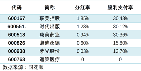 ????分紅是上市公司利潤分配的一種方式,分紅率、股利支付率也被作為選擇股票時的一項重要標準。從這一點來看,6家公司之間存在較大的差別。據Wind資訊數據,康美藥業(yè)以近十年共計28.85億元的分紅金額在6家公司中排名第一位,其后是啟迪桑德6.27億元,時代出版6.07億元,紫光股份1.24億元,聯(lián)美控股0.76億元,通策醫(yī)療則未進行分紅。