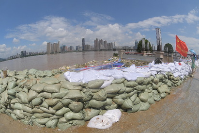 7月3日零時12分,湘江長沙站水位上升到39.51米,創(chuàng)下有記錄以來歷史新高。這是長沙城區(qū)湘江沿岸用沙袋修筑的子堤(7月3日攝)。記者 龍弘濤 攝?