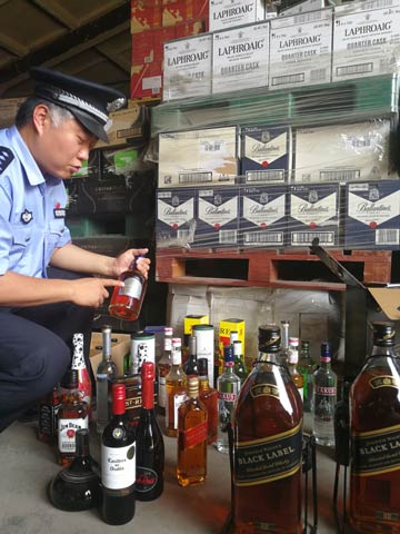 | ?辦案人員在清點走私洋酒。記者 陸敏 攝 |