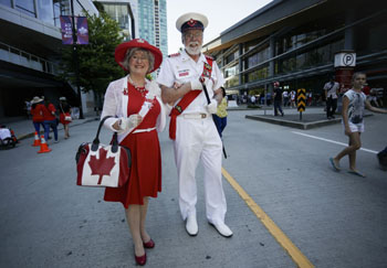 ??? 7月1日是加拿大國(guó)慶日,溫哥華當(dāng)日舉辦活動(dòng),慶祝加拿大建國(guó)150周年。 圖為一對(duì)老夫婦精心打扮參加國(guó)慶日活動(dòng)。新華社發(fā)(梁森 攝) |