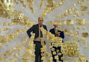 ??? 7月2日,2017上海夏季音樂(lè)節(jié)在上海交響樂(lè)團(tuán)開(kāi)幕,圖為紐約愛(ài)樂(lè)樂(lè)團(tuán)執(zhí)行董事比爾·托馬斯(左)為2017上海夏季音樂(lè)節(jié)揭曉藝術(shù)裝置《夏音》?!断囊簟酚?400個(gè)傳統(tǒng)手工制作的蟈蟈籠子組成,以聲音喚醒樂(lè)迷對(duì)童年時(shí)夏天的回憶。記者 任瓏 攝 |