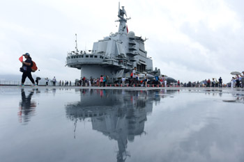 ??? 7月8日,香港市民在遼寧艦的飛行甲板上參觀。當(dāng)日,中國首艘航空母艦遼寧艦在香港開始向公眾開放。記者 秦晴 攝 |