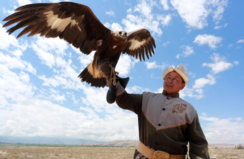??? 7月15日,在吉爾吉斯斯坦伊塞克湖附近的通村,一名養(yǎng)鷹人放飛獵鷹。當(dāng)日,吉爾吉斯斯坦傳統(tǒng)的“民族節(jié)”慶祝活動在這里舉行。新華社/歐新 |