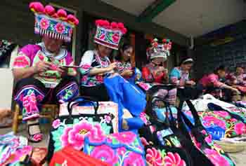 ??? 7月16日,彝族繡娘在云南省楚雄市彝人古鎮(zhèn)繡制服飾。當(dāng)日,60多名彝族民間繡娘匯集到彝人古鎮(zhèn),參與“指尖上的技藝”彝族刺繡動態(tài)展示活動。記者 楊宗友 攝 |