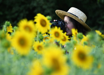 ??? 7月16日,在美國馬里蘭州的麥基·貝希爾野生生物管理區(qū),一名游客拍攝向日葵。記者 殷博古 攝 |