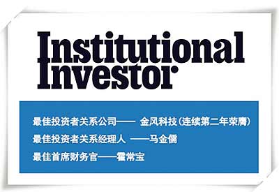 國(guó)際資本市場(chǎng)權(quán)威金融雜志《機(jī)構(gòu)投資者》(Institutional Investor)年度評(píng)獎(jiǎng)結(jié)果日益揭曉,金風(fēng)科技從2,500余家亞洲上市公司中脫穎而出,包攬“最佳投資者關(guān)系公司”、“最佳投資者關(guān)系經(jīng)理人”和“最佳首席財(cái)務(wù)官”三項(xiàng)大獎(jiǎng)。