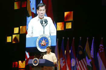 ??? 8月8日,在菲律賓馬尼拉,東盟輪值主席國菲律賓總統(tǒng)杜特爾特在慶祝儀式上講話。東盟8日在馬尼拉舉行成立50周年慶典。新華社/美聯(lián) |