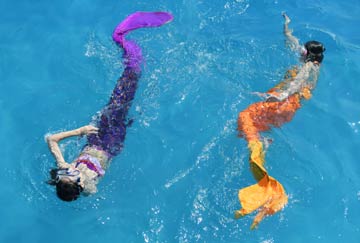 | 8月22日,重慶市氣象臺發(fā)布高溫紅色預警信號。重慶洋人街水上樂園邀請部分女游客穿上“魚尾泳裝”,在水中樂享清涼。記者 王全超 攝? |