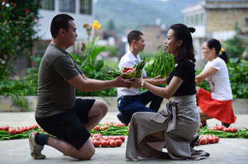 ??? 8月28日,在四川省敘永縣麻城鎮(zhèn)麻城村高山蔬菜基地,參加“浪漫采摘”活動(dòng)獲勝的情侶在“蔬菜鵲橋”旁表達(dá)愛(ài)意。當(dāng)日是七夕節(jié),麻城鎮(zhèn)舉辦七夕蔬菜采摘節(jié),吸引眾多情侶前來(lái)參加“浪漫采摘”“鵲橋獻(xiàn)愛(ài)”等趣味活動(dòng),以蔬菜為媒,表達(dá)愛(ài)意。新華社發(fā)(李欣 攝)