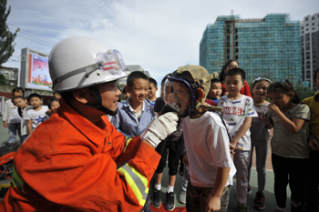 ??? 8月28日,河北承德南營(yíng)子小學(xué)學(xué)生在消防戰(zhàn)士指導(dǎo)下體驗(yàn)消防器材。當(dāng)日,南營(yíng)子小學(xué)聯(lián)合當(dāng)?shù)叵来箨?duì)開(kāi)展消防安全教育“開(kāi)學(xué)第一課”。學(xué)生們?cè)谙拦俦闹笇?dǎo)下體驗(yàn)使用消防器材,參加消防逃生演練,提升消防安全意識(shí)和自救能力。新華社發(fā)(王立群 攝)