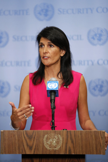 ??? 8月25日,在位于紐約的聯(lián)合國(guó)總部,美國(guó)常駐聯(lián)合國(guó)代表妮基·黑莉向媒體發(fā)表講話。黑莉說(shuō),國(guó)際原子能機(jī)構(gòu)應(yīng)“傾盡其職權(quán)”對(duì)伊朗核設(shè)施進(jìn)行檢查,并表達(dá)美國(guó)對(duì)這一進(jìn)程的支持。記者 李木子 攝
