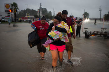 ??? 8月28日,在美國(guó)得克薩斯州休斯敦,人們從家中撤離后轉(zhuǎn)移到高地。截至當(dāng)?shù)貢r(shí)間28日晚,至少11人在颶風(fēng)“哈維”引發(fā)的災(zāi)害或事故中死亡。隨著休斯敦地區(qū)積水面積不斷擴(kuò)大,近6000人主動(dòng)前往或被營(yíng)救至臨時(shí)避難所。新華社/路透