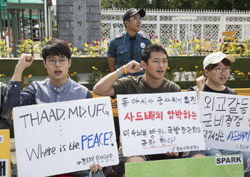 ??? 8月29日,在韓國(guó)首爾,民眾手舉反對(duì)部署“薩德”的標(biāo)語(yǔ)抗議示威。韓國(guó)民眾29日在位于首爾的韓國(guó)國(guó)防部前舉行反對(duì)部署“薩德”系統(tǒng)的集會(huì)。新華社發(fā)(李相浩 攝)