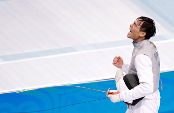 ??? 8月29日,陳海威慶祝勝利。當(dāng)日,在天津舉行的第十三屆全國(guó)運(yùn)動(dòng)會(huì)男子花劍個(gè)人賽決賽中,福建選手陳海威以15比9戰(zhàn)勝香港選手崔浩然,獲得冠軍。記者 王麗莉 攝