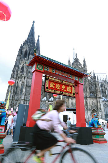 ??? 8月26日,人們?cè)诘聡?guó)科隆大教堂前舉辦的中國(guó)節(jié)上游覽。第三屆科隆中國(guó)節(jié)于8月25日至27日在科隆大教堂廣場(chǎng)舉行。北京老字號(hào)特色商品展賣、老字號(hào)傳統(tǒng)技藝現(xiàn)場(chǎng)展演、“魅力北京”旅游圖片展等活動(dòng)讓德國(guó)民眾與中國(guó)文化進(jìn)行了一次親密接觸。記者 羅歡歡 攝