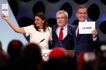 ??? 9月13日,國(guó)際奧委會(huì)主席巴赫(中)在宣布2024和2028年奧運(yùn)會(huì)主辦城市后與巴黎市長(zhǎng)伊達(dá)爾戈(左)和洛杉磯市長(zhǎng)加切蒂慶祝。當(dāng)日,國(guó)際奧委會(huì)在秘魯首都利馬舉行的第131次全會(huì)上最終確定巴黎為2024年夏季奧運(yùn)會(huì)主辦地、洛杉磯為2028年夏季奧運(yùn)會(huì)主辦地。新華社發(fā)(路易斯·卡馬喬 攝) |
