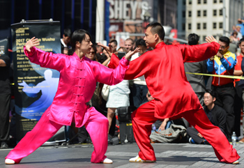 ??? 9月10日,在美國(guó)紐約時(shí)報(bào)廣場(chǎng),武術(shù)運(yùn)動(dòng)員陳思坦(右)和林旭表演“太極對(duì)練”。當(dāng)日,由中國(guó)國(guó)家體育總局與國(guó)際武術(shù)聯(lián)合會(huì)發(fā)起、以“和諧、健康、共享”為主題的武術(shù)表演活動(dòng)在時(shí)報(bào)廣場(chǎng)舉行。數(shù)十位中國(guó)優(yōu)秀武術(shù)運(yùn)動(dòng)員和美國(guó)本土武術(shù)愛好者共同在這里為觀眾獻(xiàn)上太極拳、太極扇、太極對(duì)練、集體拳等表演,展示了中國(guó)武術(shù)文化的風(fēng)采。記者 李睿 攝 |