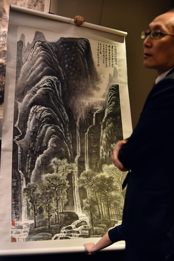??? 圖為蘇富比工作人員在介紹即將拍賣的李可染的作品《千巖競(jìng)秀 萬(wàn)壑爭(zhēng)流》。新華社發(fā) (王璽 攝) |