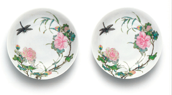 據(jù)清宮造辦處活計(jì)檔記載,雍正十年五月二十四日,“首領(lǐng)薩木哈持出畫琺瑯芙蓉四寸瓷碟一件,傳旨:照此碟尺寸,畫黑地白梅花四寸瓷碟一對(duì)?!眰魇狼鍖m御用琺瑯彩、粉彩瓷器上也屢見芙蓉圖樣。蜻蜓是詠春詩(shī)詞中常見的物象,劉禹錫的《春詞》“新妝宜面下朱樓,深鎖春光一院愁。行到中庭數(shù)花朵,蜻蜓飛上玉搔頭。”最為人稱道,但在繪畫和工藝品上遠(yuǎn)不如蛺蝶和象征多子的螽斯常見,可見清乾隆粉彩過(guò)枝芙蓉蜻蜓紋盤格外珍罕。其造辦處承做的皇家用器,每一件皆需經(jīng)過(guò)“呈核再做”的程序。制作前必先讓宮廷畫師繪出圖樣,經(jīng)胤禛批閱同意之后下發(fā)御窯廠燒造,其畫稿設(shè)計(jì)也必經(jīng)幾番修改。據(jù)考證,畫樣出自宮廷畫師蔣廷錫、鄒一桂之手,二者師出惲壽平門下,強(qiáng)調(diào)形準(zhǔn)風(fēng)格,其花鳥畫沿襲自南唐徐崇嗣的沒骨畫法,寫生寫意并重,設(shè)色秾麗,筆調(diào)雅逸。清秦祖永《桐陰論畫》評(píng)鄒一桂之花卉“用重粉點(diǎn)瓣。后以淡色籠染。粉質(zhì)凸出縑素上?!边@種用重粉營(yíng)造質(zhì)感,以淡色渲染的風(fēng)格,與我們所見這件清乾隆粉彩過(guò)枝芙蓉蜻蜓紋盤如出一轍。繪畫風(fēng)格來(lái)看,符合雍正皇帝的審美取向,也融入了雍正皇帝的鑒賞韻味。升平盛世天子雅好,宮廷畫師和御窯高手配合無(wú)間,最終成就了這件精雅美妙如寫生小品的粉彩珍瓷。