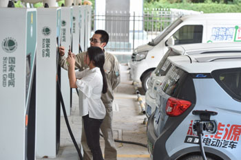 ??? 9月27日,在福建省南安市一處國(guó)家電網(wǎng)電動(dòng)汽車充電站,市民(前)向技術(shù)人員了解充電操作流程。國(guó)慶將至,電動(dòng)汽車租賃市場(chǎng)升溫,不少租車公司、共享汽車企業(yè)紛紛推出針對(duì)電動(dòng)汽車用戶的出行套餐。記者 宋為偉 攝 |