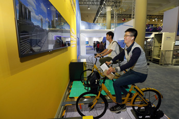 ??? 9月26日,參觀者在體驗(yàn)共享單車互動(dòng)騎行。當(dāng)日,在北京展覽館舉行的“砥礪奮進(jìn)的五年”大型成就展正式面向公眾開放,展覽中的多種互動(dòng)體驗(yàn)式展區(qū)、展品吸引眾多參觀者參觀。記者 沈伯韓 攝 |