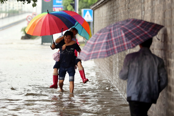 ??? 9月25日,在江蘇省常州市街頭,行人走過積水路段。當(dāng)日上午,江蘇省氣象臺(tái)發(fā)布暴雨橙色預(yù)警信號(hào),南京中北部、淮安南部、常州、鎮(zhèn)江、無錫等地出現(xiàn)連續(xù)3小時(shí)50毫米降水,交通出行受到明顯影響。新華社發(fā)(陳暐 攝) |
