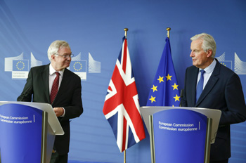 ??? 9月25日,在比利時(shí)首都布魯塞爾,歐盟首席談判代表巴尼耶(右)與英國(guó)“脫歐”事務(wù)大臣戴維·戴維斯出席記者會(huì)。歐盟與英國(guó)25日在布魯塞爾啟動(dòng)第四輪“脫歐”談判,巴尼耶呼吁英方在“脫歐”談判中能更“清晰”。與以往三輪談判一樣,此輪談判為期4天,雙方繼續(xù)就公民權(quán)利、“‘脫歐’賬單”、北愛爾蘭邊界等議題進(jìn)行討價(jià)還價(jià)。記者 葉平凡 攝 |