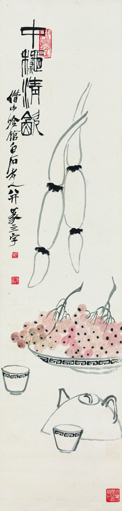 1917年仲夏,正逢護法運動興起,湘南兵荒馬亂,齊白石只身赴京以避匪患。初到北京,幾經(jīng)輾轉(zhuǎn),齊白石寓居法源寺,以賣畫治印為生。此時的齊白石醉心于八大山人,冷逸有余,富貴不足,因此作品少人問津。不久后,當(dāng)時已屬京華畫壇領(lǐng)袖的陳師曾走訪法源寺,諫言齊白石不必求俗媚世,應(yīng)沖破藩籬,自創(chuàng)風(fēng)格。年逾五旬的齊老聽取了陳師曾的勸言,開始自己的“衰年變法”。