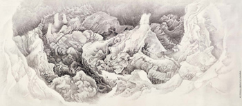 此次這件《山原的凝視》,正是受讓·奧古斯特·多米尼克·安格爾的名作《露易斯·奧松維爾夫人》的啟發(fā),畫中夫人的眼神引起了劉丹的注意與無限的遐想,她瞳孔中的深邃透閃著神秘的光芒,充滿了無法捉摸的可能,正是在這迷人的眼神之中,劉丹的心中閃現(xiàn)出了一脈奇幻的山原。藝術家將古今中西的經(jīng)緯彌合在了一仁瞳孔之中,他讓我們在奧松維爾夫人的凝視中看見了另一個維度中的山原川澤。