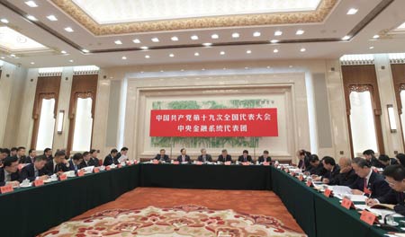 10月19日,十九大部分代表團(tuán)討論向中外記者開放。這是中央金融系統(tǒng)代表團(tuán)在討論。新華社記者 陳建力/攝