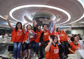??? 隨著香港交易所10月27日收市鈴聲響起,最后兩位穿紅馬甲的交易員結(jié)束交易,準(zhǔn)備收拾辦公用品離開。自此,香港證券業(yè)在交易大堂內(nèi)進(jìn)行交易的時代畫上圓滿句號。圖為身穿紅馬甲的交易員在揮手告別。新華社發(fā)(王申 攝) |