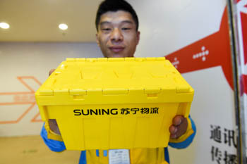 ??? 10月31日,江蘇南京蘇寧云倉物流基地工作人員展示“共享快遞盒”。據(jù)首家使用和推廣“共享快遞盒”的蘇寧易購介紹,電商物流將智能包裝和末端服務(wù)相結(jié)合,采用可循環(huán)的特制快遞包裝盒代替?zhèn)鹘y(tǒng)常用紙箱,每個特制快遞盒成本25元,可循環(huán)使用1000余次。記者 李博 攝 |