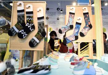 ??? 浙江諸暨市大唐鎮(zhèn)襪藝小鎮(zhèn)內(nèi)展示的襪子。記者 韓傳號 攝 |