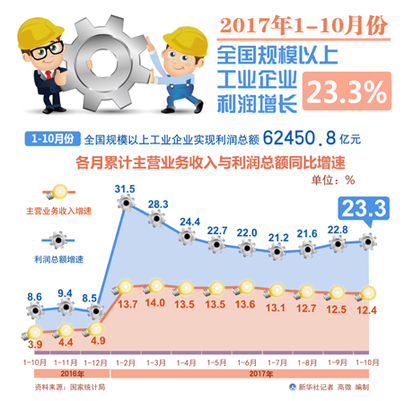 數(shù)據(jù)顯示,2017年1-10月份,規(guī)模以上工業(yè)企業(yè)利潤(rùn)同比增長(zhǎng)23.3%,增速比1-9月份加快0.5個(gè)百分點(diǎn)。其中,10月份利潤(rùn)同比增長(zhǎng)25.1%,增速雖比9月份減緩2.6個(gè)百分點(diǎn),但仍是今年以來(lái)月度較高增速。