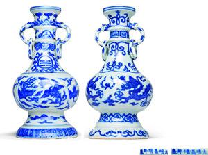 | 明嘉靖 青花龍鳳紋活環(huán)雙耳瓶一對? |