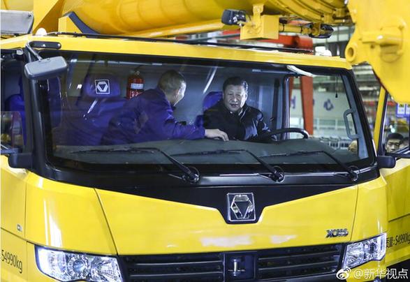 正在徐工集團(tuán)考察的習(xí)近平,坐進(jìn)剛下線的XCA220型全地面起重機(jī)駕駛室,向技術(shù)人員詳細(xì)詢問起重機(jī)的性能、產(chǎn)量、價(jià)格等。