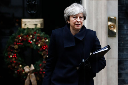 ??? 12月11日,在英國(guó)倫敦,英國(guó)首相特雷莎·梅走出唐寧街10號(hào)首相府。特雷莎·梅11日說(shuō),英國(guó)預(yù)計(jì)向歐盟支付350億至390億英鎊(約合470億至520億美元)的“脫歐分手費(fèi)”,但條件是雙方未來(lái)要達(dá)成一份貿(mào)易協(xié)議。新華社/法新