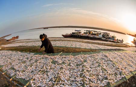 ??? 12月8日,在江西鄱陽(yáng)湖都昌印山附近湖灘,漁民在晾曬鳳尾魚(yú)干。連日來(lái),江西鄱陽(yáng)湖畔魚(yú)干飄香。漁民將捕獲的鳳尾魚(yú)晾曬,加工成魚(yú)干供應(yīng)各地市場(chǎng)。新華社發(fā)(傅建斌 攝)