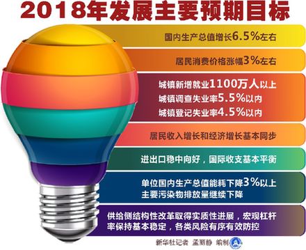 政府工作報告提出,今年發(fā)展主要預(yù)期目標是:國內(nèi)生產(chǎn)總值增長6.5%左右;居民消費價格漲幅3%左右;城鎮(zhèn)新增就業(yè)1100萬人以上,城鎮(zhèn)調(diào)查失業(yè)率5.5%以內(nèi),城鎮(zhèn)登記失業(yè)率4.5%以內(nèi);居民收入增長和經(jīng)濟增長基本同步;進出口穩(wěn)中向好,國際收支基本平衡;單位國內(nèi)生產(chǎn)總值能耗下降3%以上,主要污染物排放量繼續(xù)下降;供給側(cè)結(jié)構(gòu)性改革取得實質(zhì)性進展,宏觀杠桿率保持基本穩(wěn)定,各類風險有序有效防控。