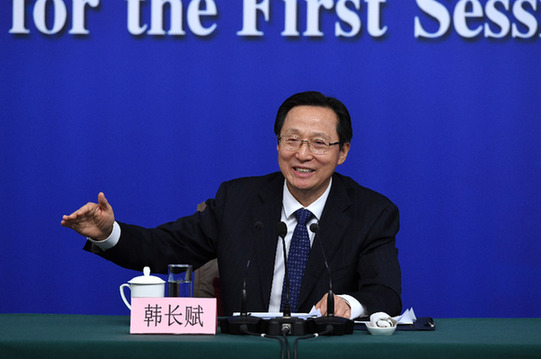 3月7日,十三屆全國人大一次會(huì)議新聞中心舉行記者會(huì)。農(nóng)業(yè)部部長韓長賦等就“實(shí)施鄉(xiāng)村振興戰(zhàn)略 推動(dòng)農(nóng)業(yè)轉(zhuǎn)型升級(jí)”答記者問。新華社記者 申宏 攝