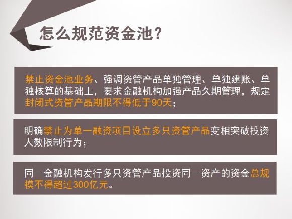 該負(fù)責(zé)人說(shuō),資管新規(guī)的總體思路是按照資管產(chǎn)品的類型制定統(tǒng)一的監(jiān)管標(biāo)準(zhǔn),對(duì)同類資管業(yè)務(wù)作出一致性規(guī)定,實(shí)行公平的市場(chǎng)準(zhǔn)入和監(jiān)管,最大程度地消除監(jiān)管套利空間,為資管業(yè)務(wù)健康發(fā)展創(chuàng)造良好的制度環(huán)境。