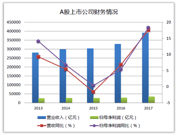 4月末,A股上市公司2017年年報(bào)披露結(jié)束。Wind統(tǒng)計(jì)數(shù)據(jù)顯示,2017年,A股上市公司的營(yíng)收、凈利潤(rùn)同比都有較大幅度上升。截至2017年12月,A股上市公司共3467家,實(shí)現(xiàn)營(yíng)業(yè)收入38.96萬億元,同比增加17.2%,歸母凈利潤(rùn)3.35萬億元,同比增18.3%,歸母凈利潤(rùn)增速高于營(yíng)業(yè)收入增速。滬深兩市公司在經(jīng)濟(jì)發(fā)展的韌性、結(jié)構(gòu)優(yōu)化、新動(dòng)能等方面呈現(xiàn)出多個(gè)新亮點(diǎn),高質(zhì)量發(fā)展的趨勢(shì)正在形成。