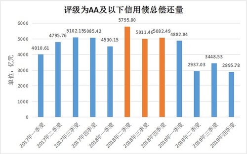 據(jù)WIND資訊統(tǒng)計(jì),評(píng)級(jí)等級(jí)較低的AA及以下信用債總償還量在今年二季度達(dá)5795.80億元,接下來(lái)的三季度和四季度并未有明顯減少,分別為5011.46億元和5082.49億元。而在信用風(fēng)險(xiǎn)的影響下,今年以來(lái),取消、推遲發(fā)行的各類債券有300余支,涉及金額約2000億元。