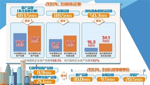 匯總中央和地方情況,2017年全國國有企業(yè)資產總額183.5萬億元,負債總額118.5萬億元,國有資本及權益總額50.3萬億元。全國國有企業(yè)境外總資產16.7萬億元。