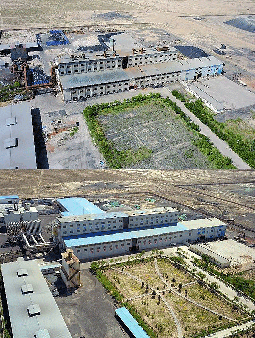 這是一張拼版照片。上圖為2017年6月12日拍攝的停業(yè)整頓的張掖市巨龍鐵合金有限公司;
