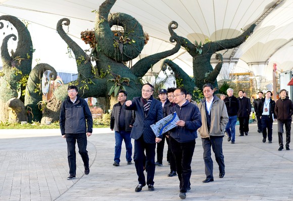 馮經(jīng)明(左三)調(diào)研世博項(xiàng)目。資料照片